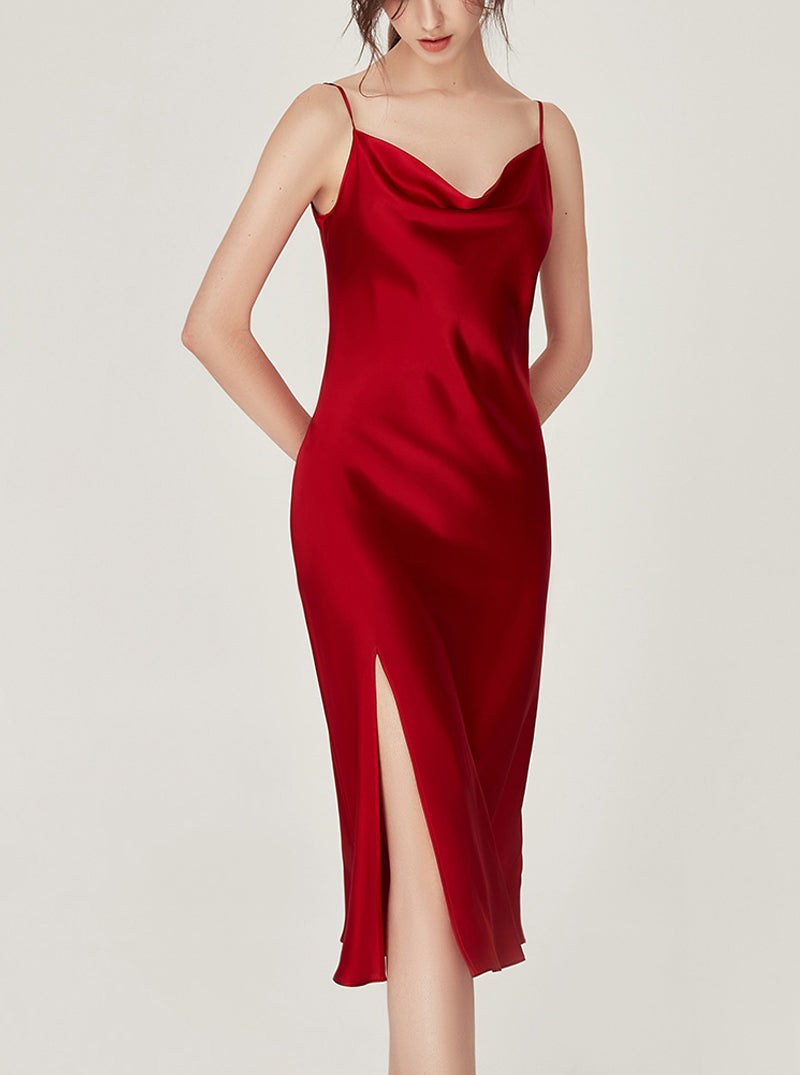 19 Momme Silk Elegant Cowl-neck Simplicity Sexy Red Split Hem Slim Medium Length Sling Nightdress