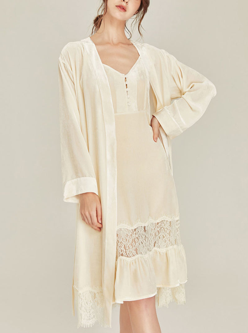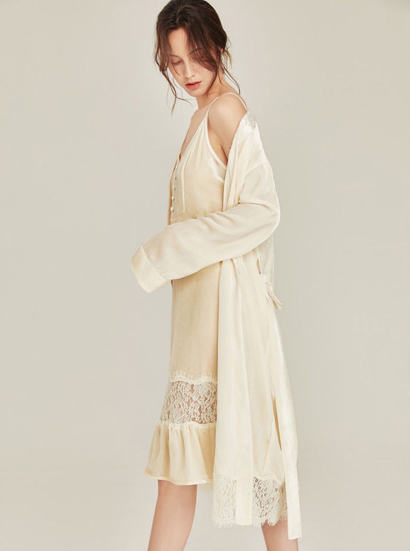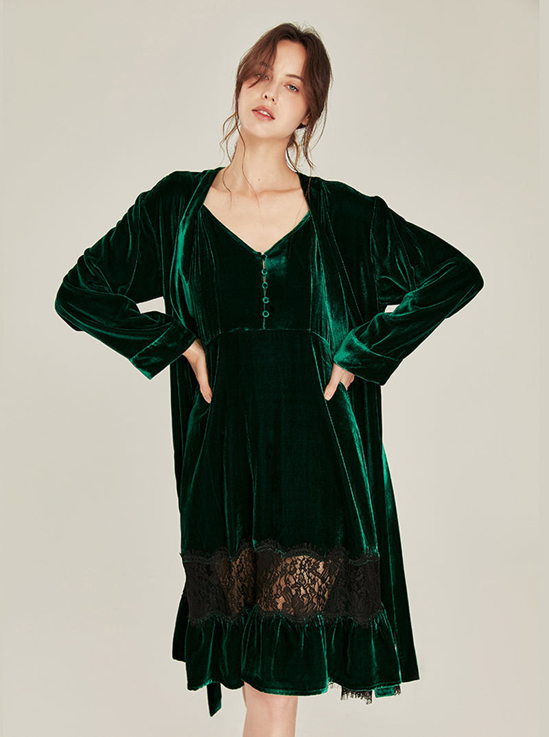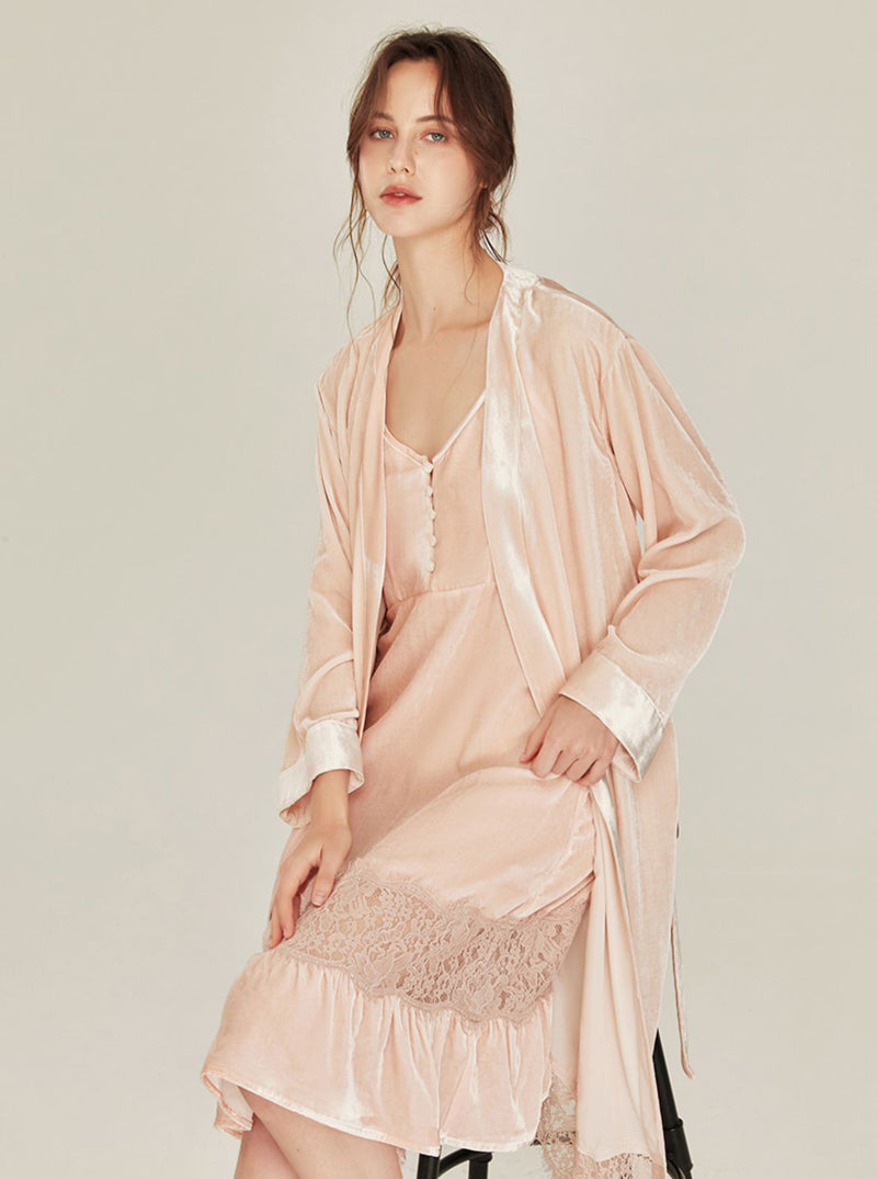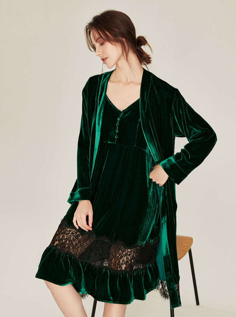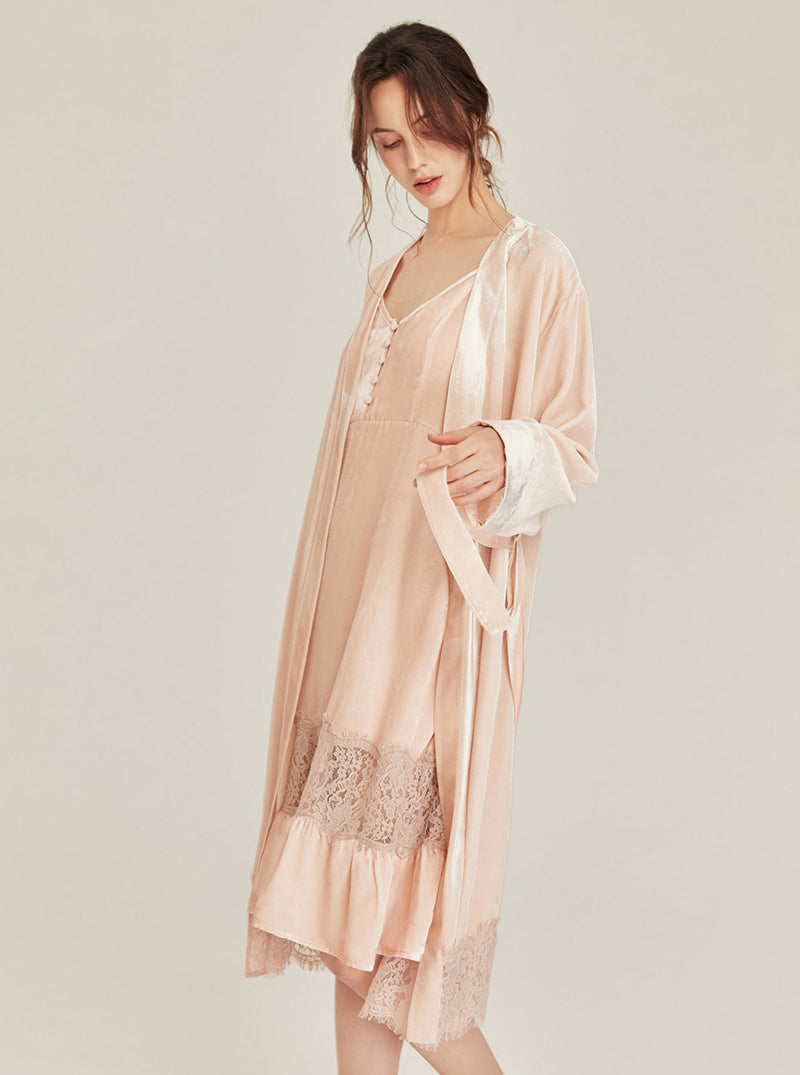 Autumn Winter Silk Velvet Female Medium Length Matching Pajamas V Collar Lace Stitching Hem Slim Sling Nightdress And Night-Robe Set