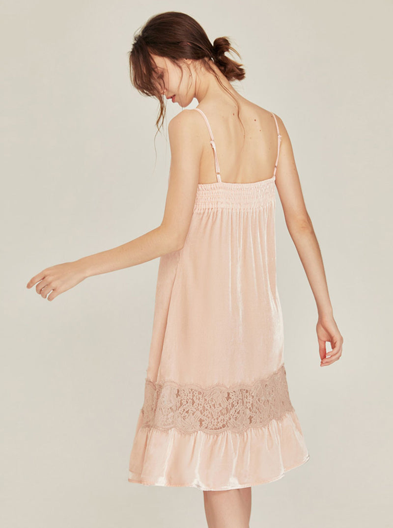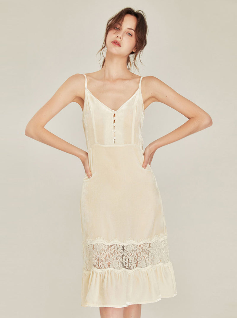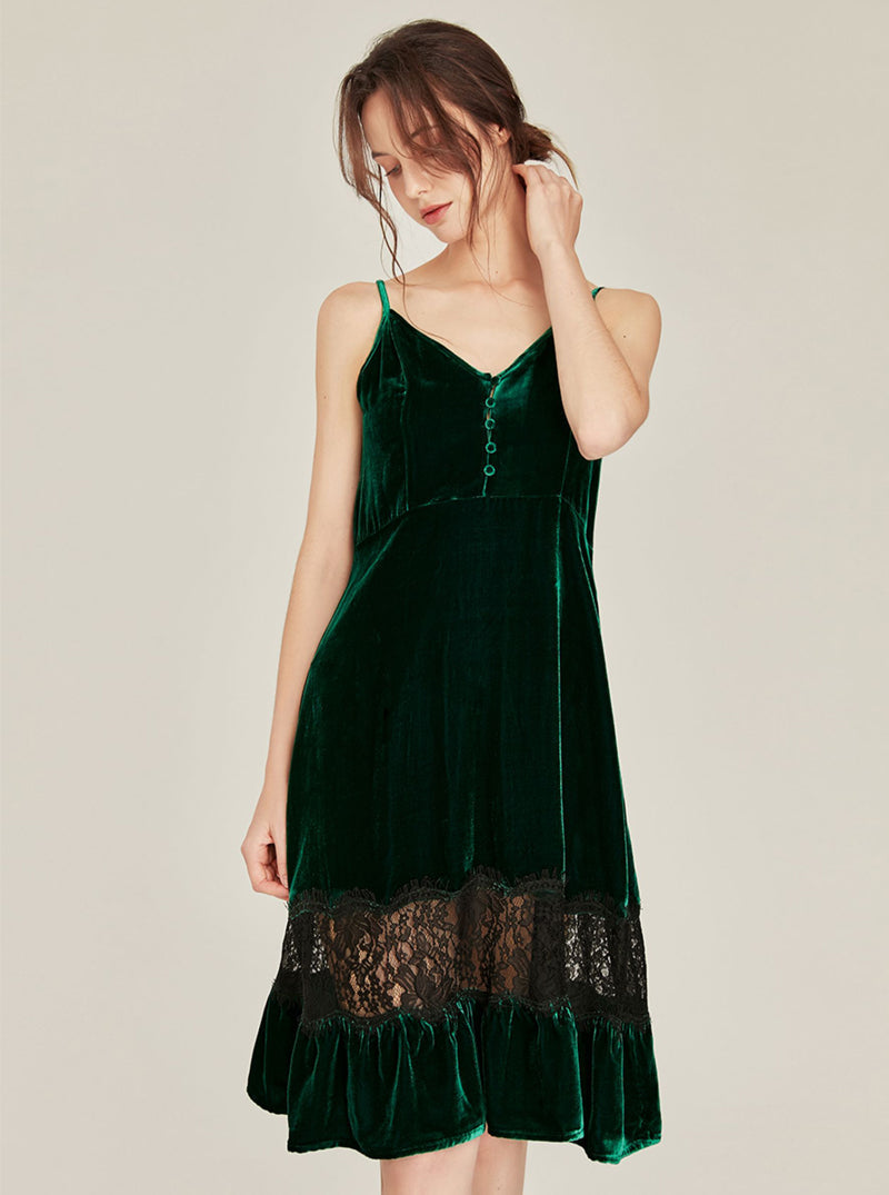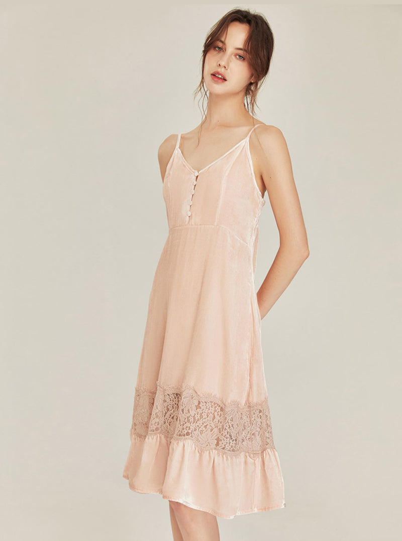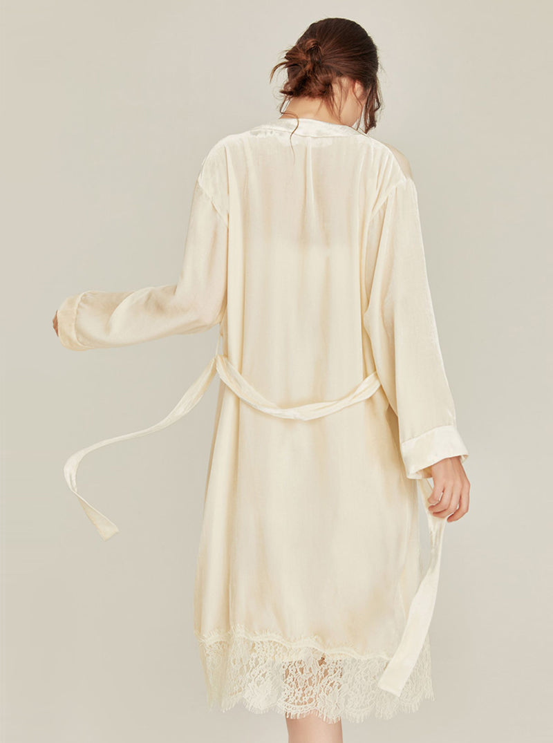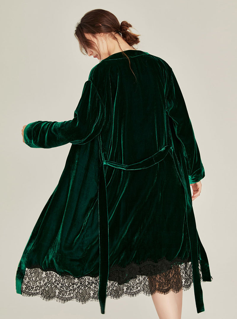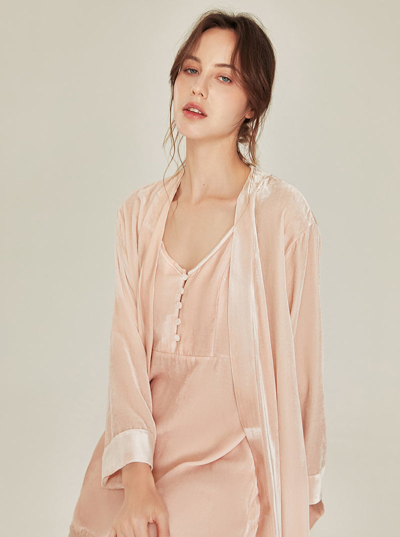 Autumn Winter Silk Velvet Female Medium Length Matching Pajamas V Collar Lace Stitching Hem Slim Sling Nightdress And Night-Robe Set