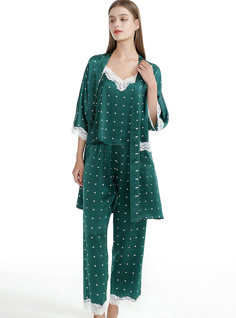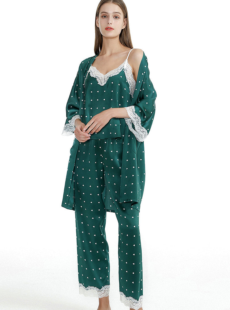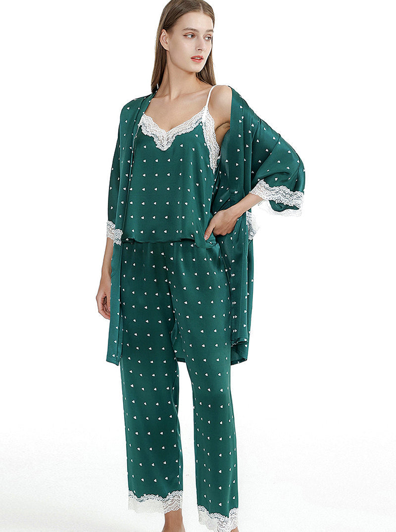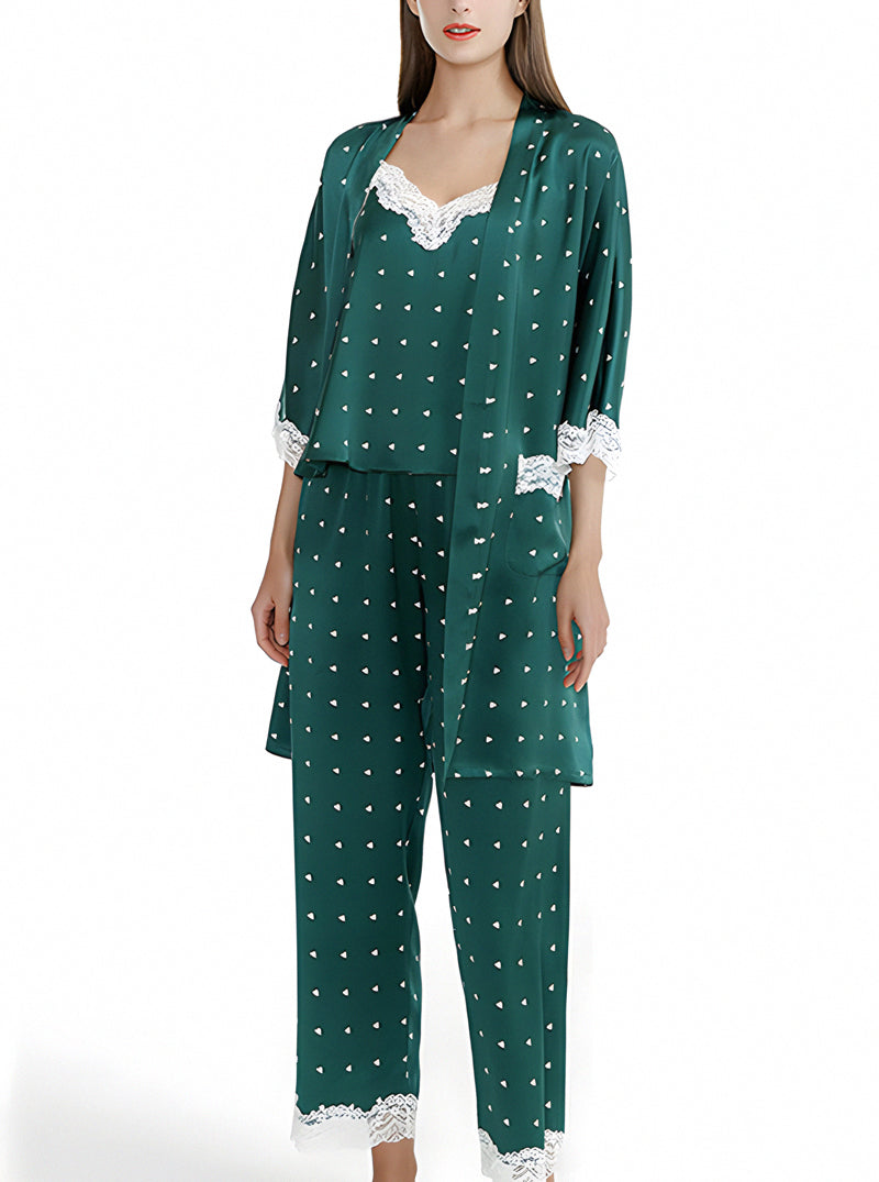 Dark Green Silk Female Summer Suspenders V-Neck Sexy Lace Polka Dot Simple Pajamas Three-Piece Set