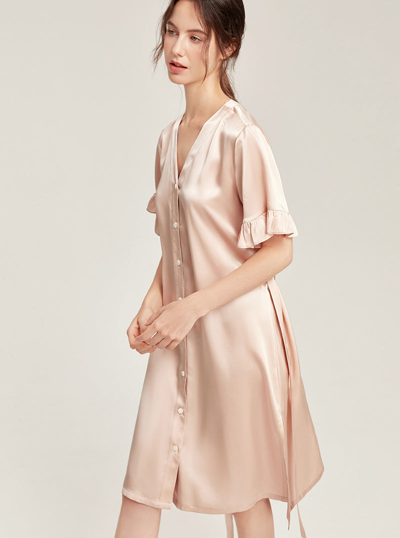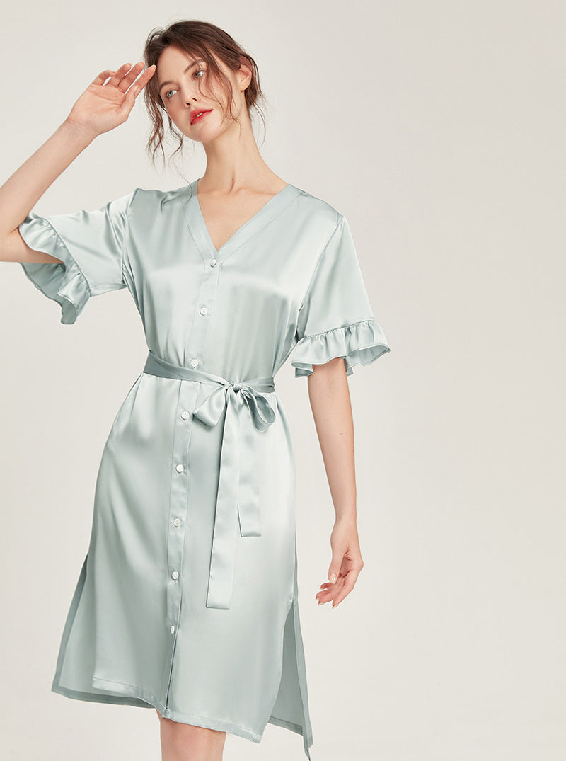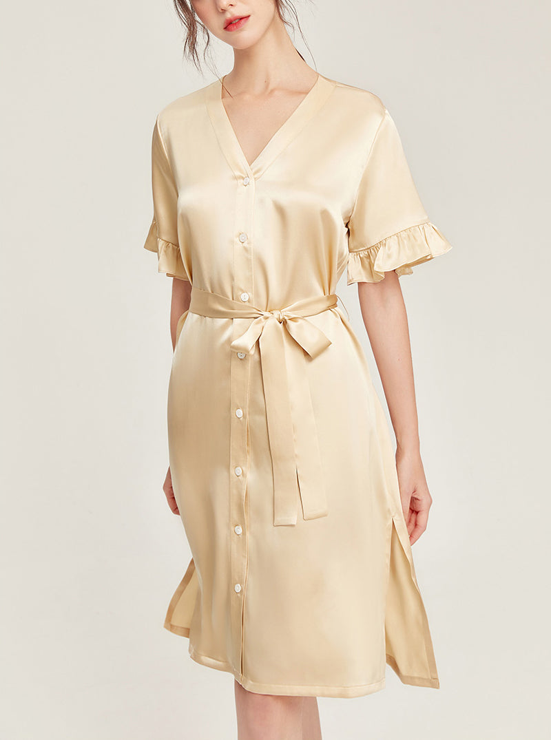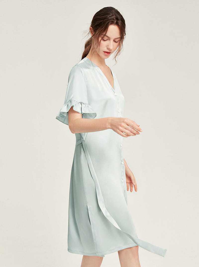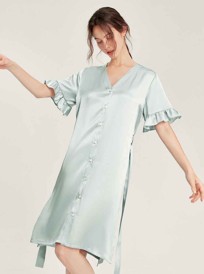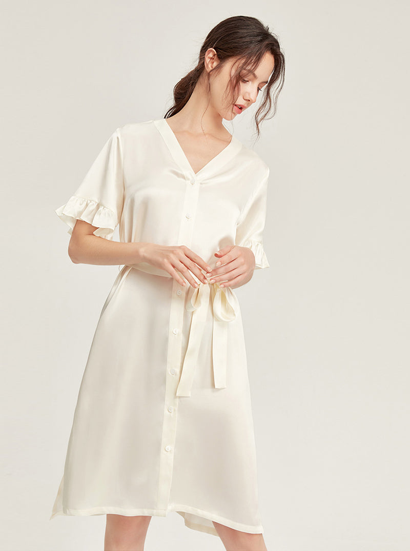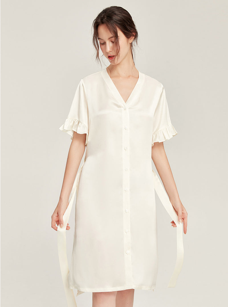 Female Summer 19 Momme Pure Color Silk Buttons V Collar Split Hem Ruffle Short Sleeve Medium Length Night-Robe