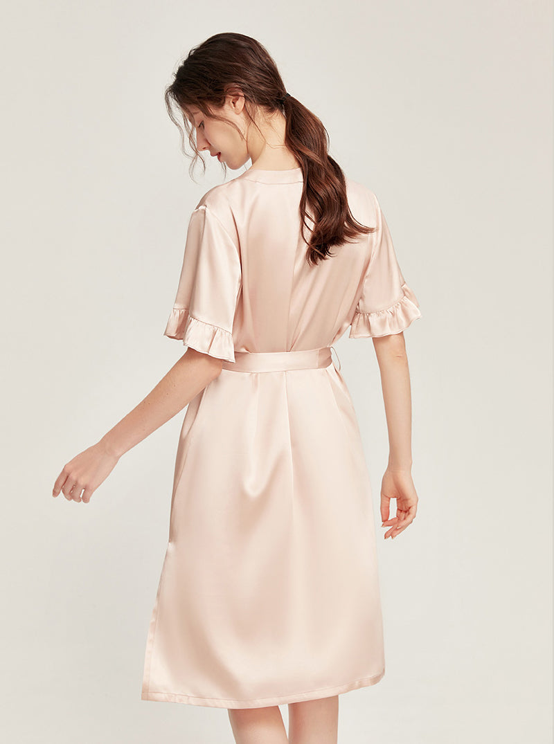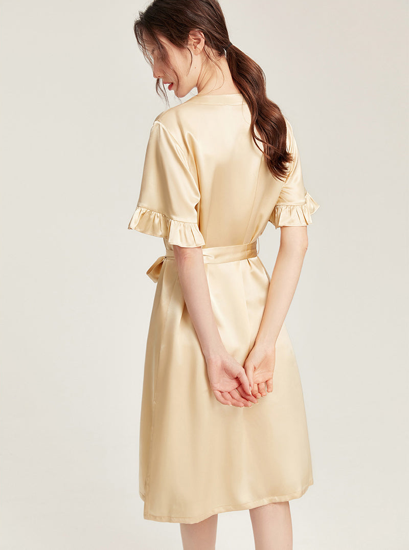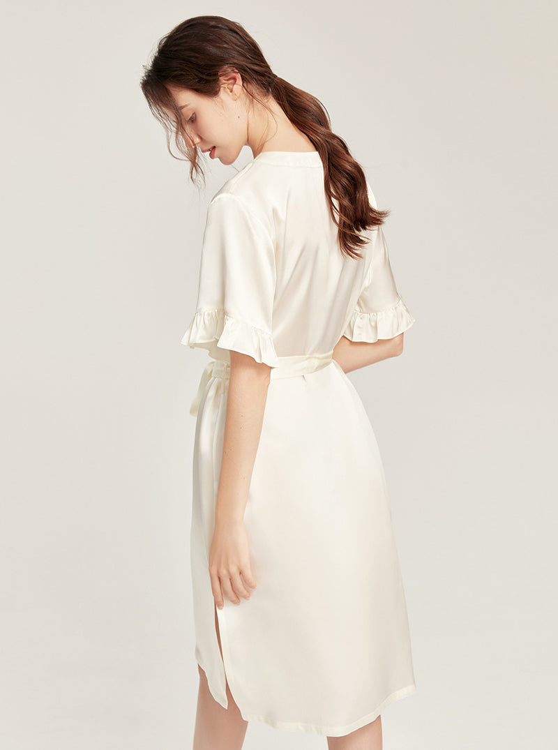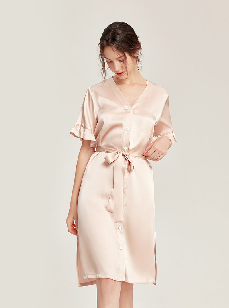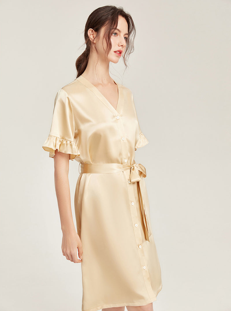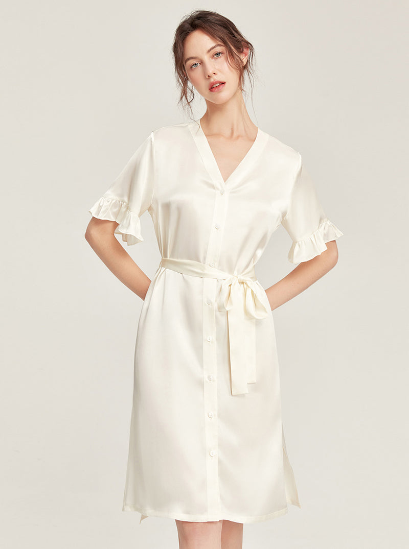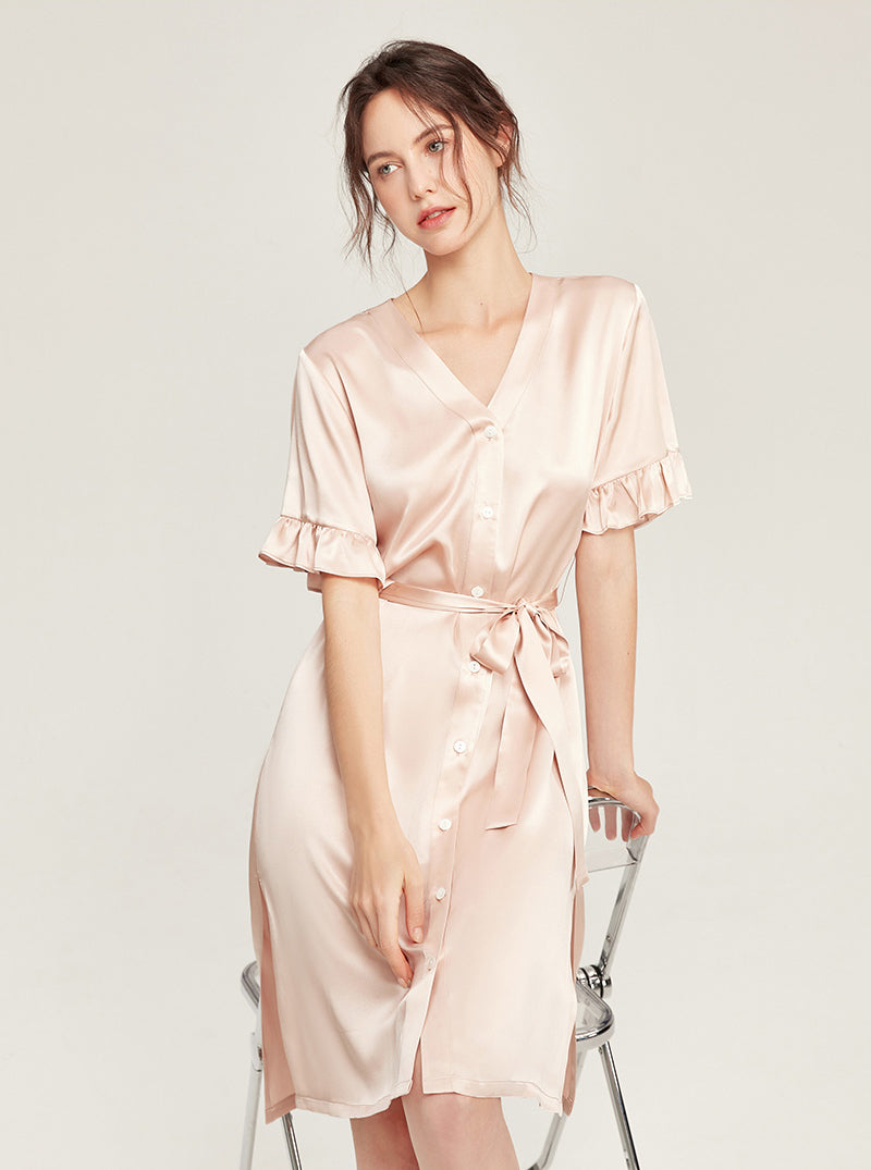 Female Summer 19 Momme Pure Color Silk Buttons V Collar Split Hem Ruffle Short Sleeve Medium Length Night-Robe